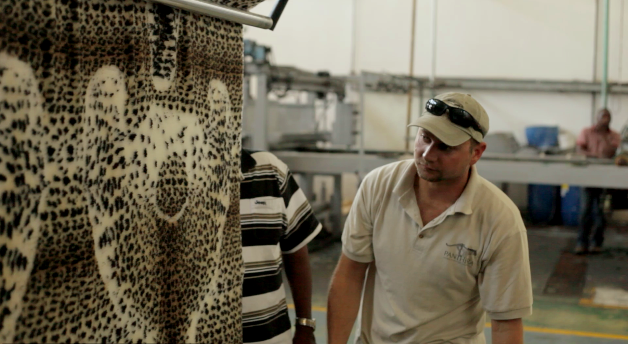 The Panthera group funded the process for Dickerson and his partner to travel around South Africa to find a factory that has the complex machinery to design and weave fabric that could hold multiple different colours and shapes, as the natural print of a leopard is not symmetrical or repeated. Unfortunately none of the factories in South Africa could manufacture the design.
