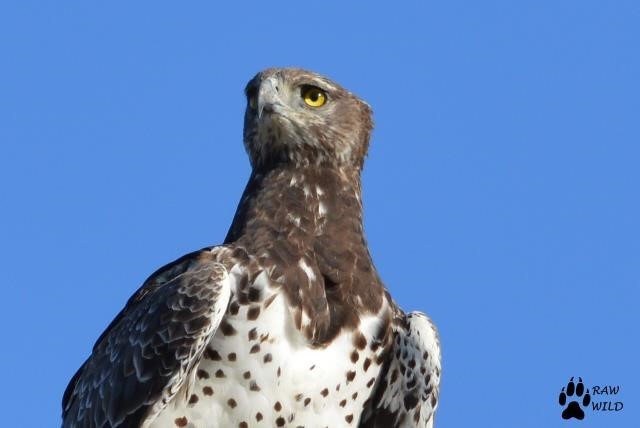 A close up of a Marshal Eagle. This photograph was taken in the Kruger National Park when we saw a shadow fly over us while driving, we slowed down to inspect and saw this magnificent Eagle on a dead tree right next to the road. We were very lucky to have this sighting to ourselves and got to spend about 10 minutes with it while it scanned the area for prey.